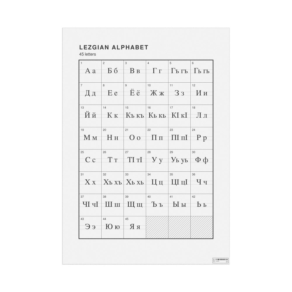 The Lezgian alphabet chart (the full set of letters) in the 23.4 x 33.1 in (59.4 x 84.1 cm, poster / wall chart) format.