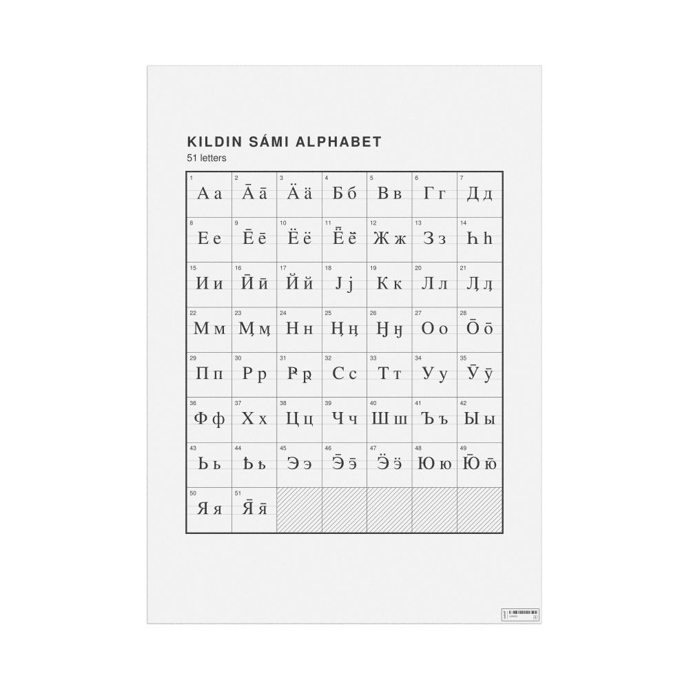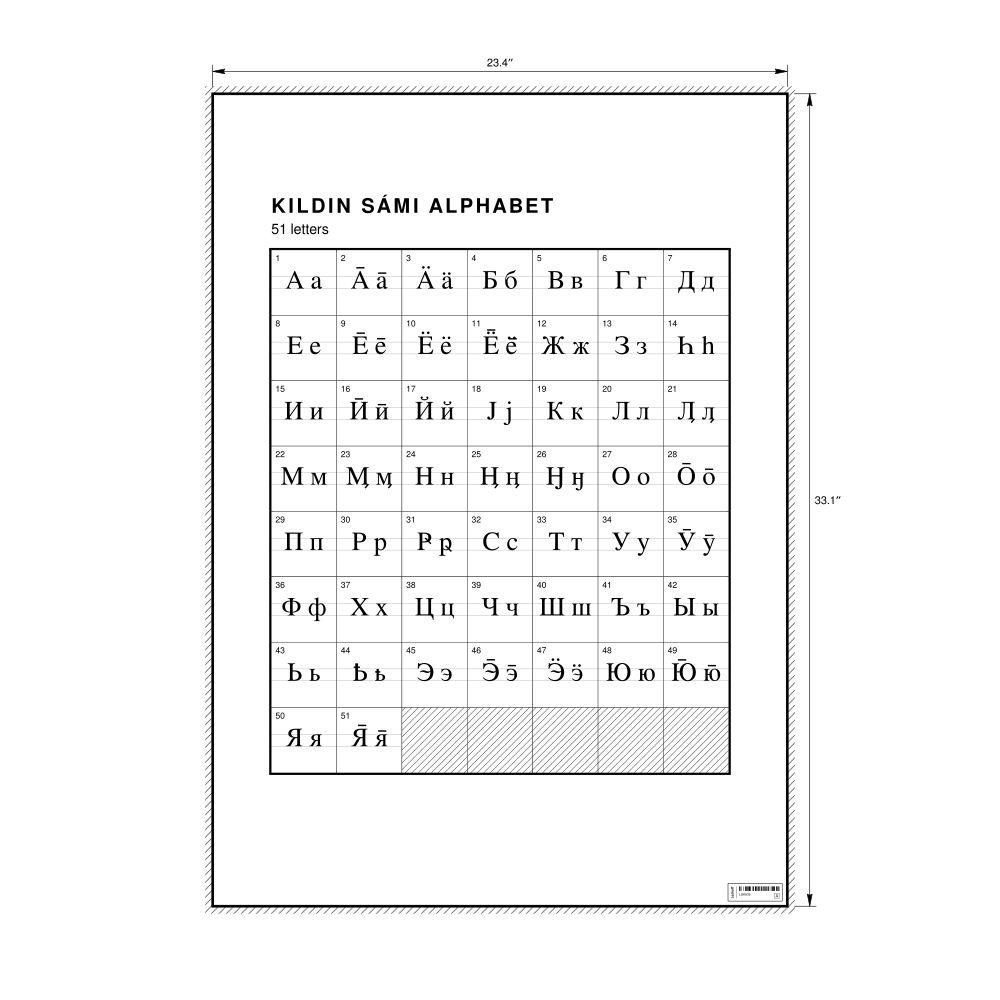 The Kildin Sámi alphabet chart (the full set of letters) in the 23.4 x 33.1 in (59.4 x 84.1 cm, poster / wall chart) format.
