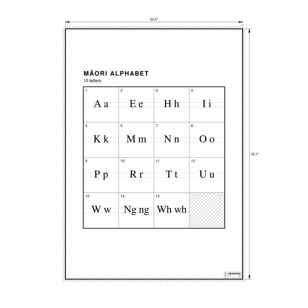 The Māori alphabet chart (the full set of letters) in the 23.4 x 33.1 in (59.4 x 84.1 cm, poster / wall chart) format.