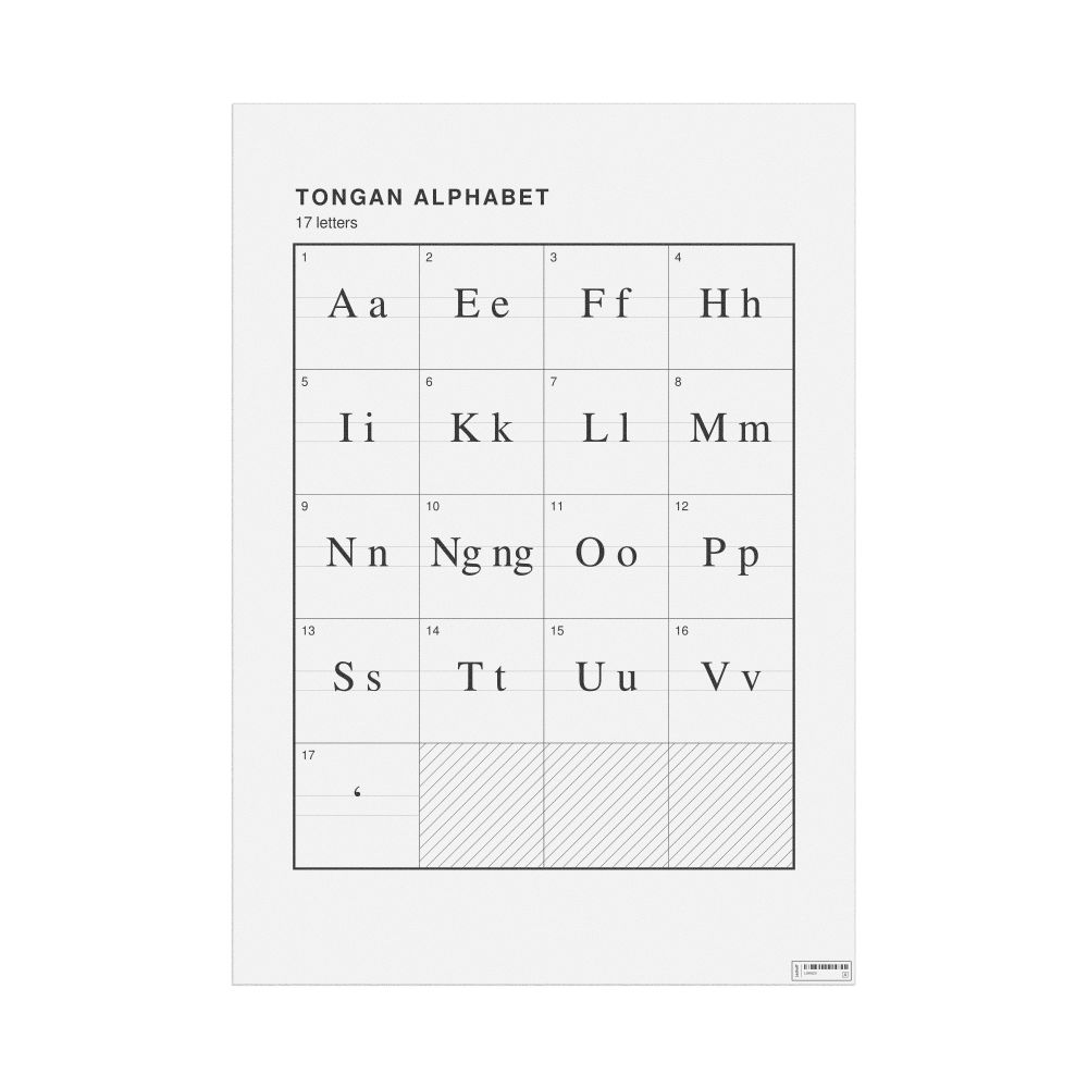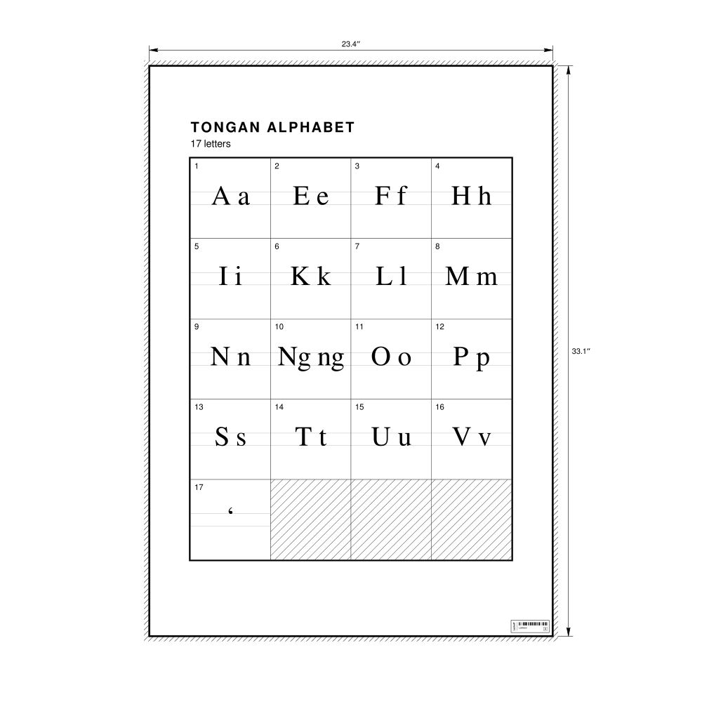 The Tongan alphabet chart (the full set of letters) in the 23.4 x 33.1 in (59.4 x 84.1 cm, poster / wall chart) format.