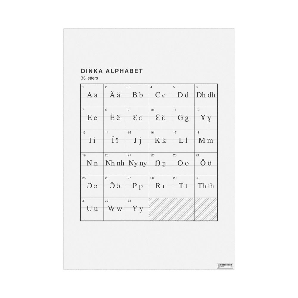 The Dinka alphabet chart (the full set of letters) in the 23.4 x 33.1 in (59.4 x 84.1 cm, poster / wall chart) format.
