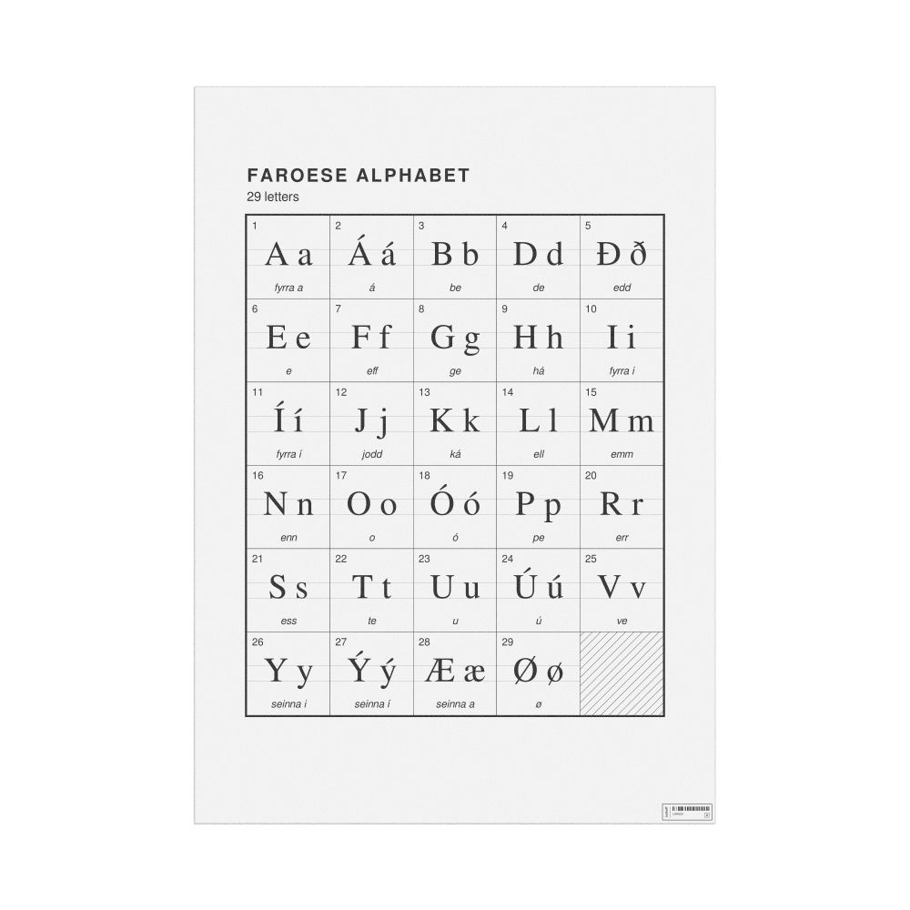 The Faroese alphabet chart (the full set of letters) in the 23.4 x 33.1 in (59.4 x 84.1 cm, poster / wall chart) format.