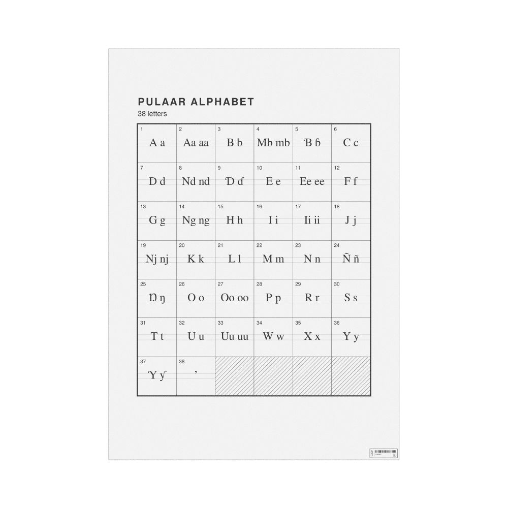 The Pulaar alphabet chart (the full set of letters) in the 23.4 x 33.1 in (59.4 x 84.1 cm, poster / wall chart) format.