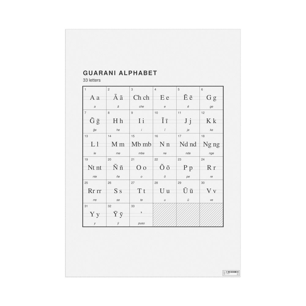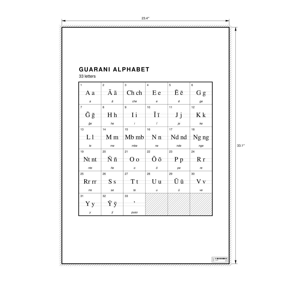 The Guarani alphabet chart (the full set of letters) in the 23.4 x 33.1 in (59.4 x 84.1 cm, poster / wall chart) format.
