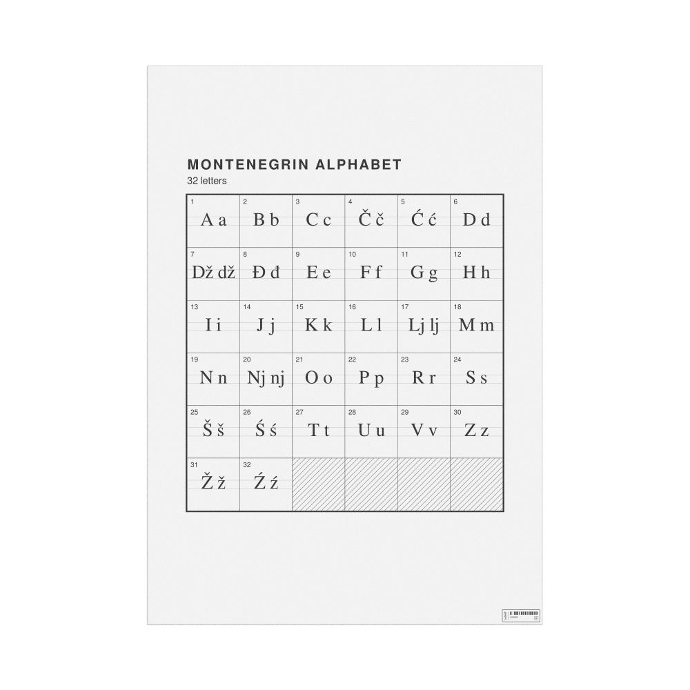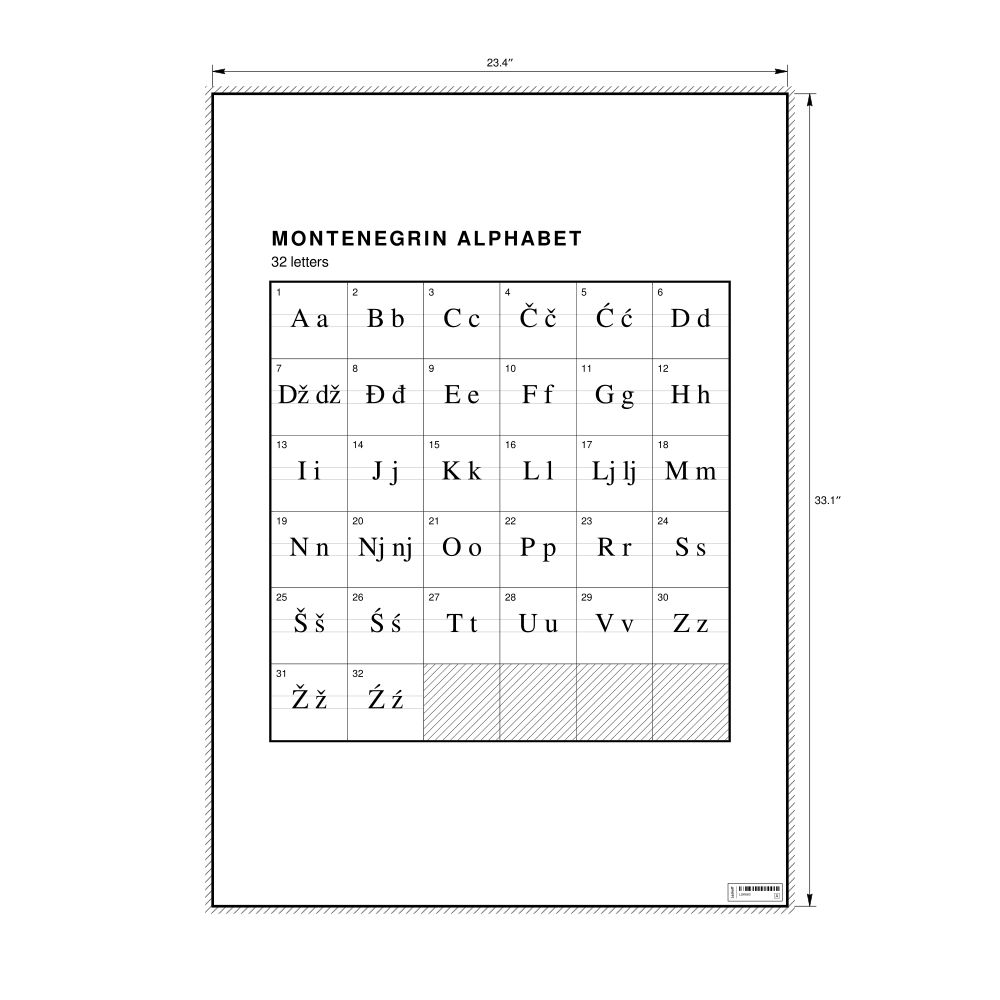 The Montenegrin alphabet chart (the full set of letters) in the 23.4 x 33.1 in (59.4 x 84.1 cm, poster / wall chart) format.
