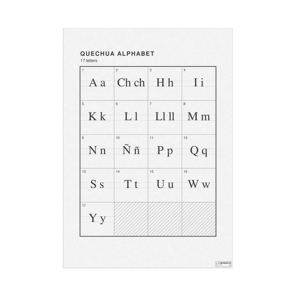 The Quechua alphabet chart (the full set of letters) in the 23.4 x 33.1 in (59.4 x 84.1 cm, poster / wall chart) format.