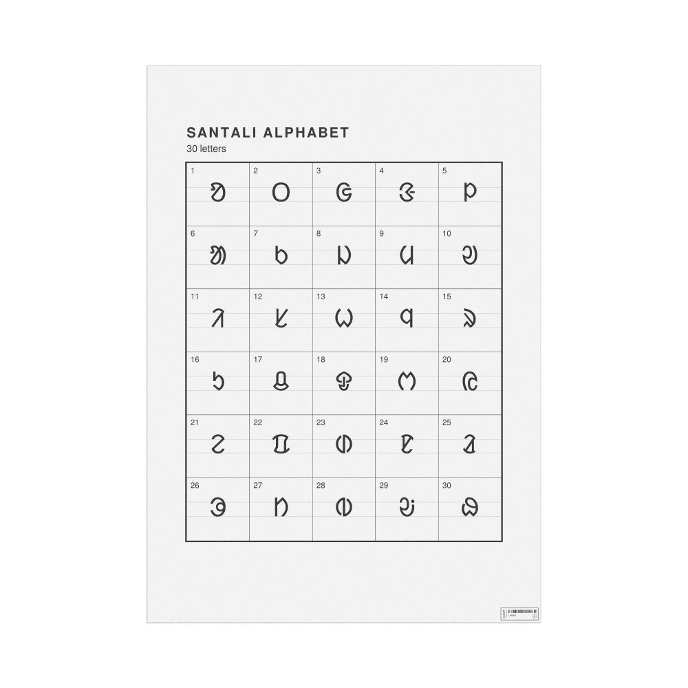The Santali alphabet chart (the full set of letters) in the 23.4 x 33.1 in (59.4 x 84.1 cm, poster / wall chart) format.