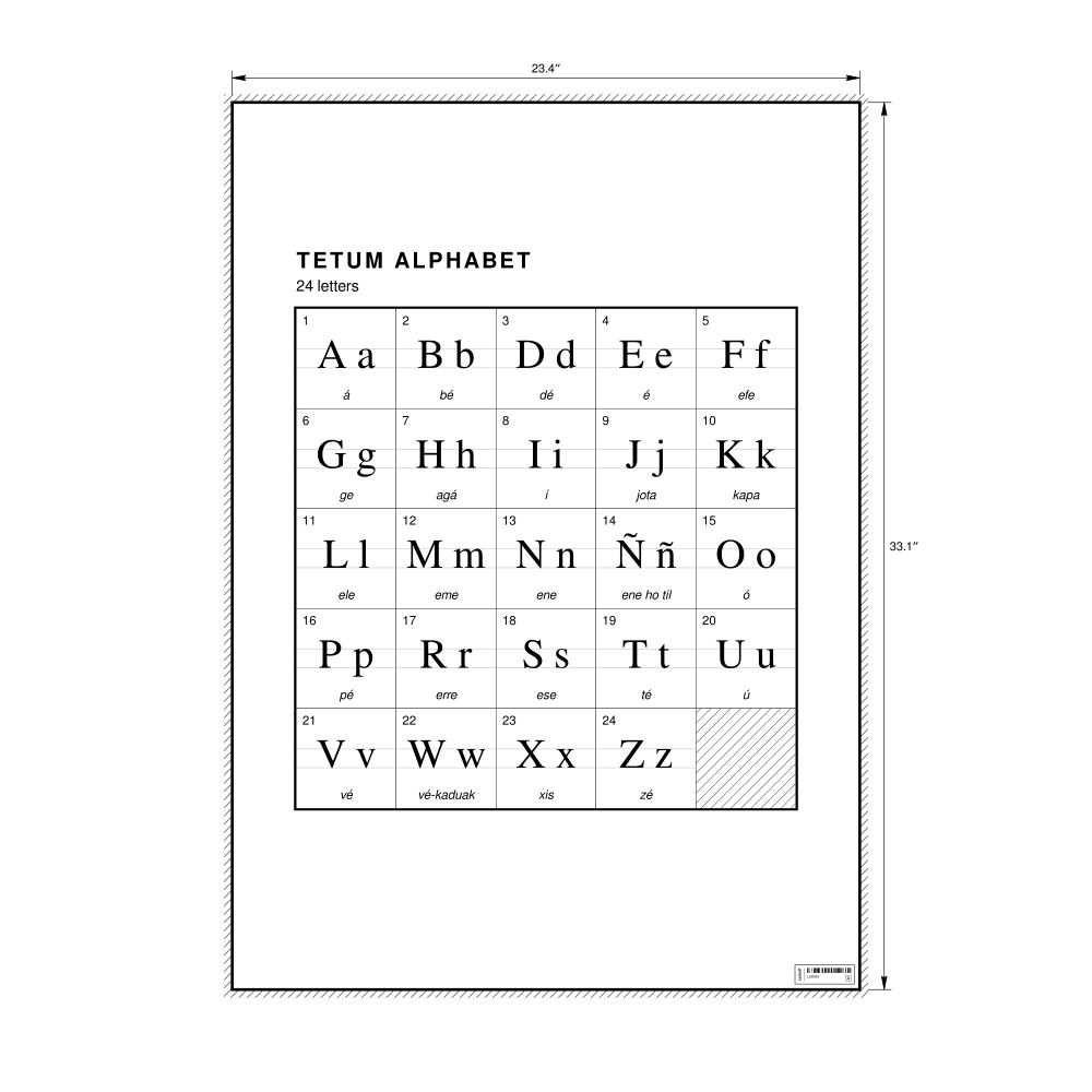 The Tetum alphabet chart (the full set of letters) in the 23.4 x 33.1 in (59.4 x 84.1 cm, poster / wall chart) format.