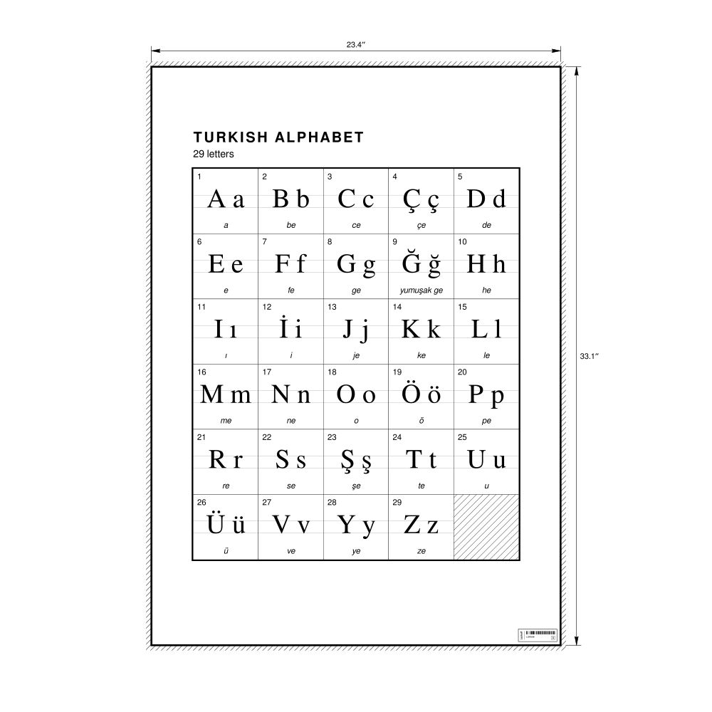 The Turkish alphabet chart (the full set of letters) in the 23.4 x 33.1 in (59.4 x 84.1 cm, poster / wall chart) format.