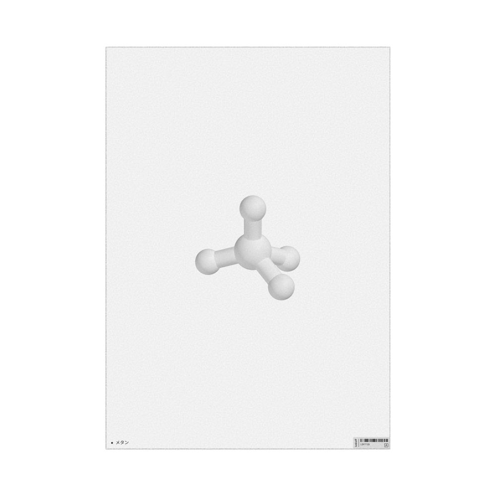 A poster featuring the ball-and-stick model of the methane molecule in Japanese (メタン).