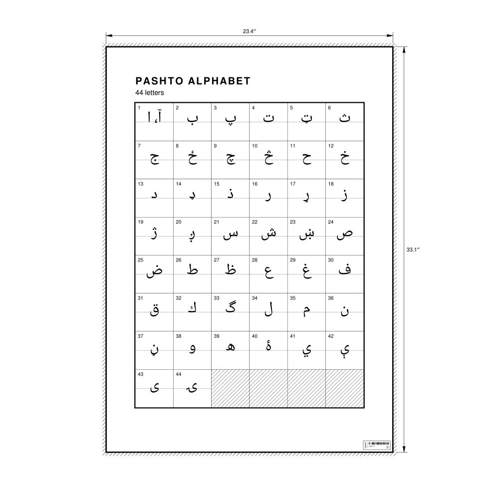 The Pashto alphabet chart (the full set of letters) in the 23.4 x 33.1 in (59.4 x 84.1 cm, poster / wall chart) format.