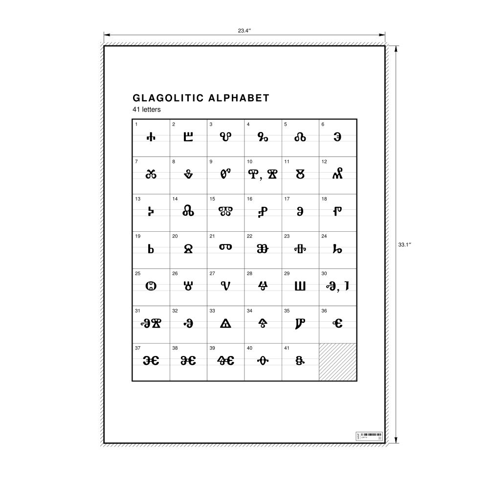 The Glagolitic alphabet chart (the full set of letters) in the 23.4 x 33.1 in (59.4 x 84.1 cm, poster / wall chart) format.