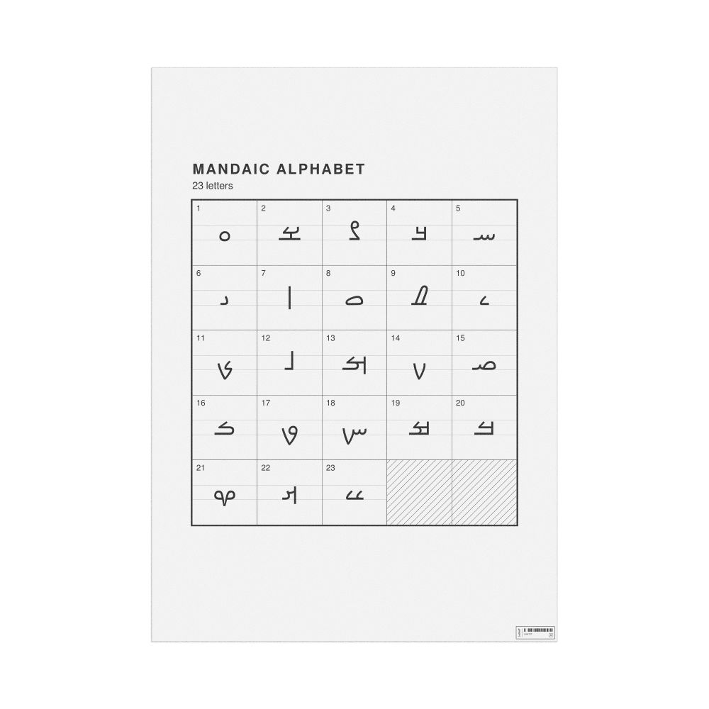 The Mandaic alphabet chart (the full set of letters) in the 23.4 x 33.1 in (59.4 x 84.1 cm, poster / wall chart) format.