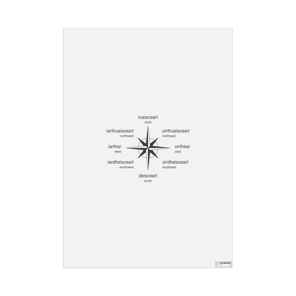 A poster of the cardinal directions (also known as compass points) in Irish (Airde an chompáis) with English translations.