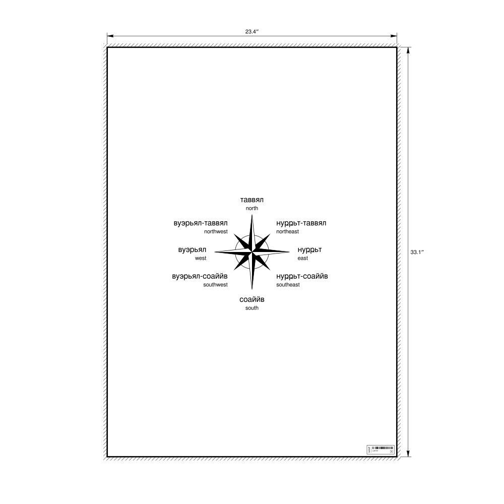 A poster of the cardinal directions (also known as compass points) in Kildin Sámi (Эллмант пель) with English translations.