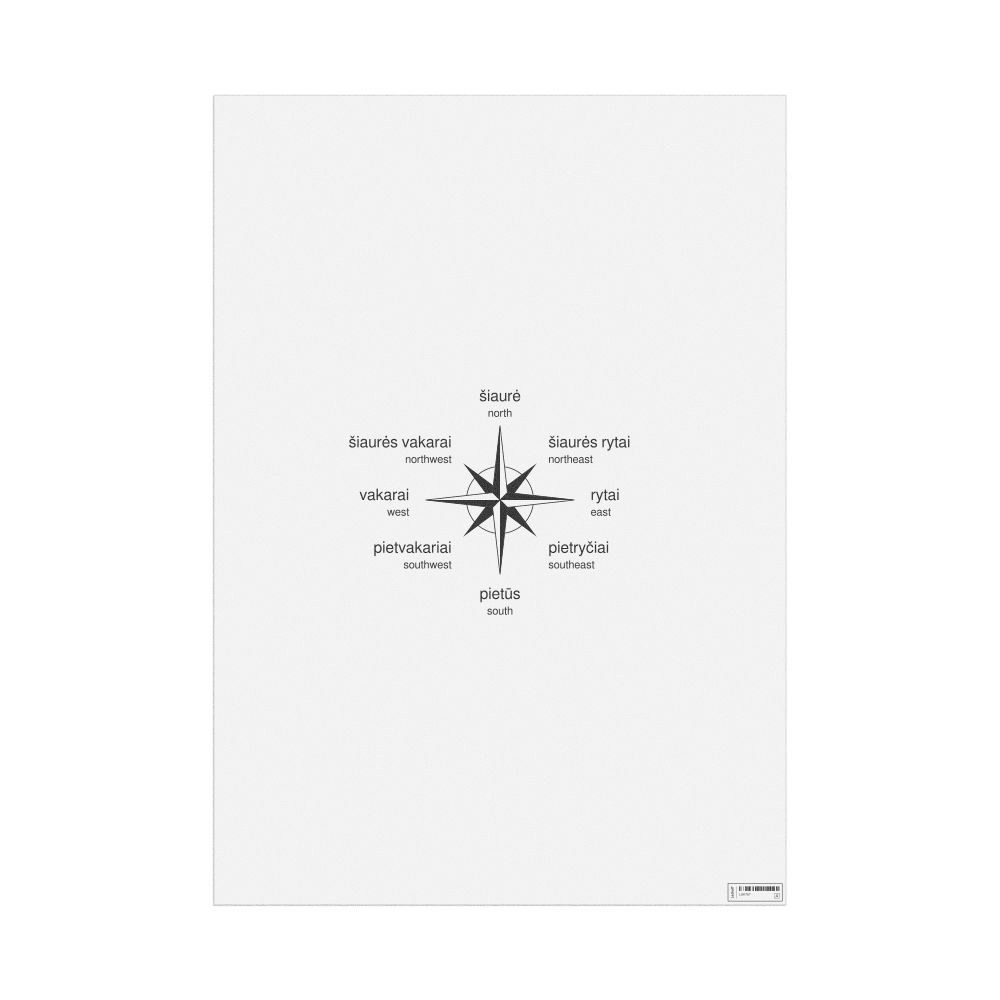 A poster of the cardinal directions (also known as compass points) in Lithuanian (Pasaulio kryptys) with English translations.
