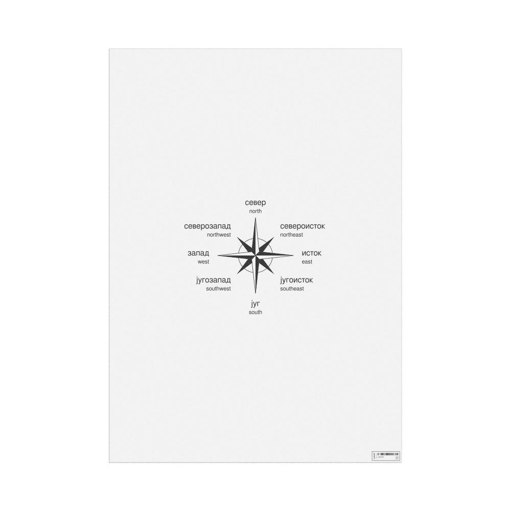 A poster of the cardinal directions (also known as compass points) in Macedonian (Страни на светот) with English translations.