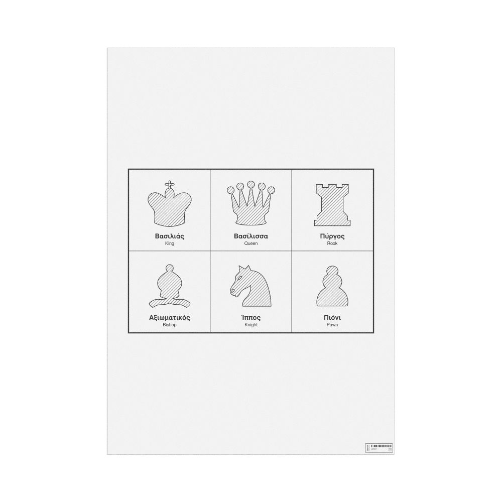 A poster of the chess pieces in Greek (Σκακιστικά κομμάτια) with English translations.