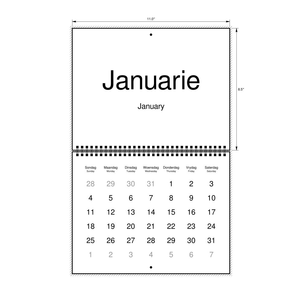 2026 Wall CalendarAfrikaans/English-Labeled, Sunday-Start Layout, Wire-Bound, 11 x 8.5 in (27.9 x 21.6 cm)