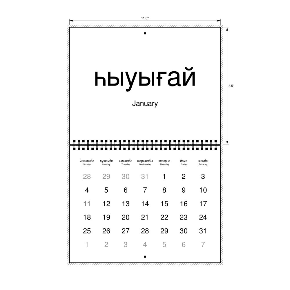 2026 Wall CalendarBashkir/English-Labeled, Sunday-Start Layout, Wire-Bound, 11 x 8.5 in (27.9 x 21.6 cm)