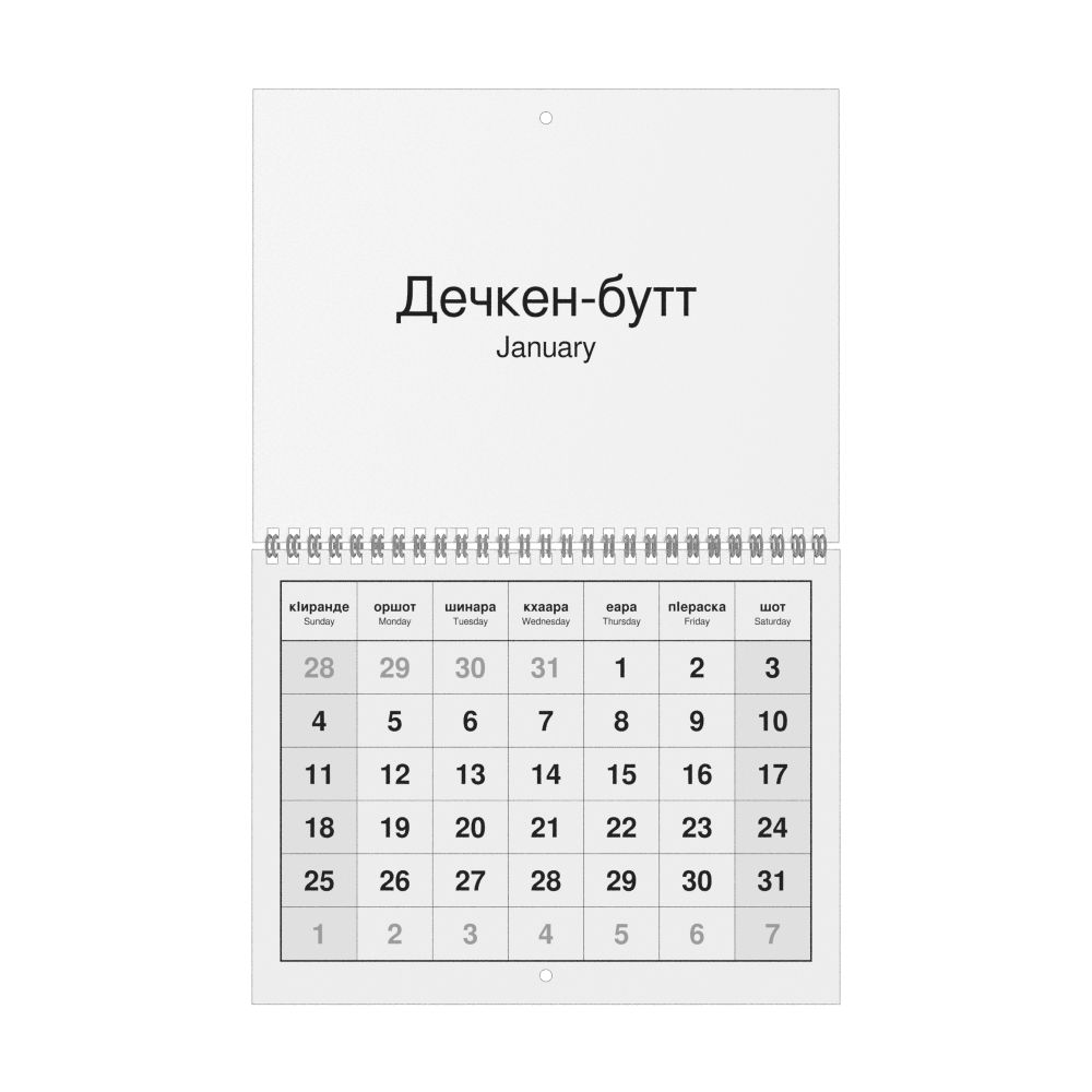 2026 Wall CalendarChechen/English-Labeled, Sunday-Start Layout, Wire-Bound, 11 x 8.5 in (27.9 x 21.6 cm)