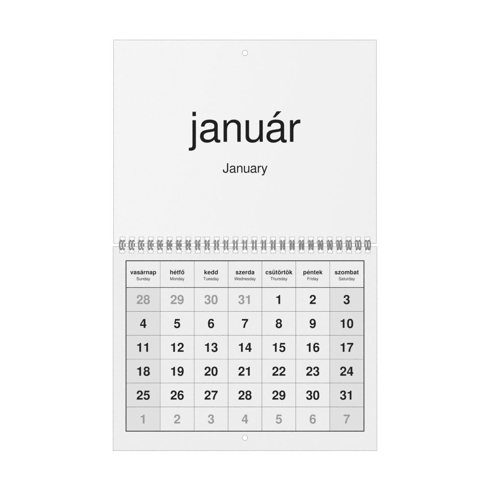 2026 Wall CalendarHungarian/English-Labeled, Sunday-Start Layout, Wire-Bound, 11 x 8.5 in (27.9 x 21.6 cm)