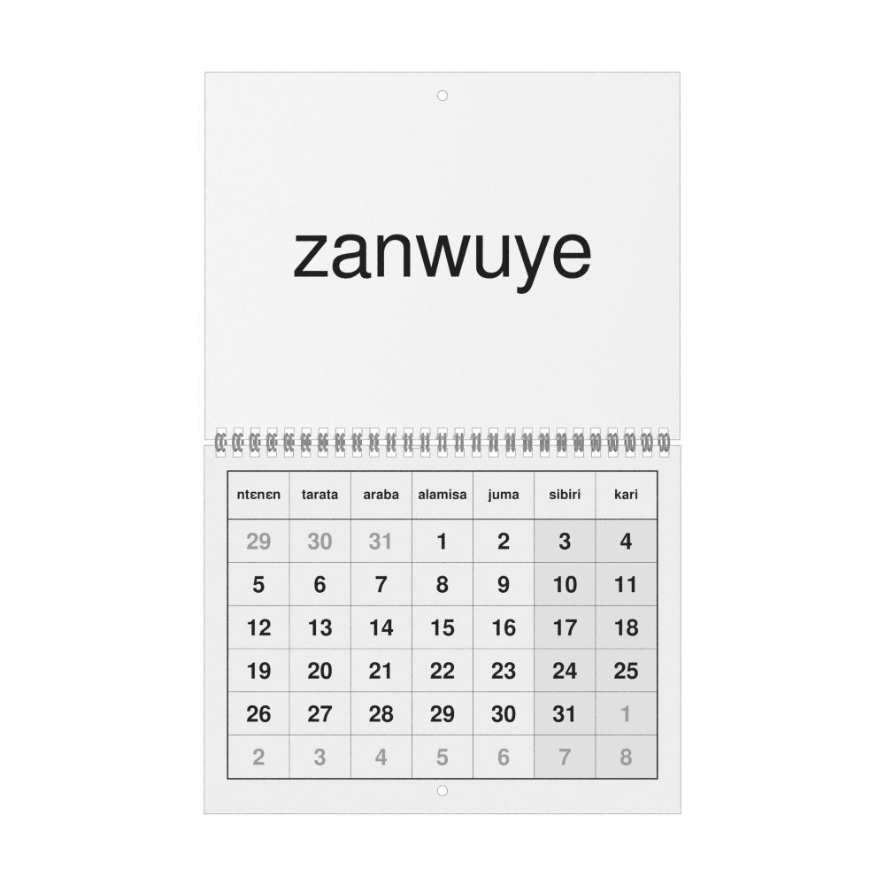 This calendar features the Bambara names of months and days of the week on top of a standard Gregorian calendar layout. Beyond its utility for tracking dates, it serves as an educational tool, cultural touchstone (cultural artifact), and functional decor (aesthetic object).