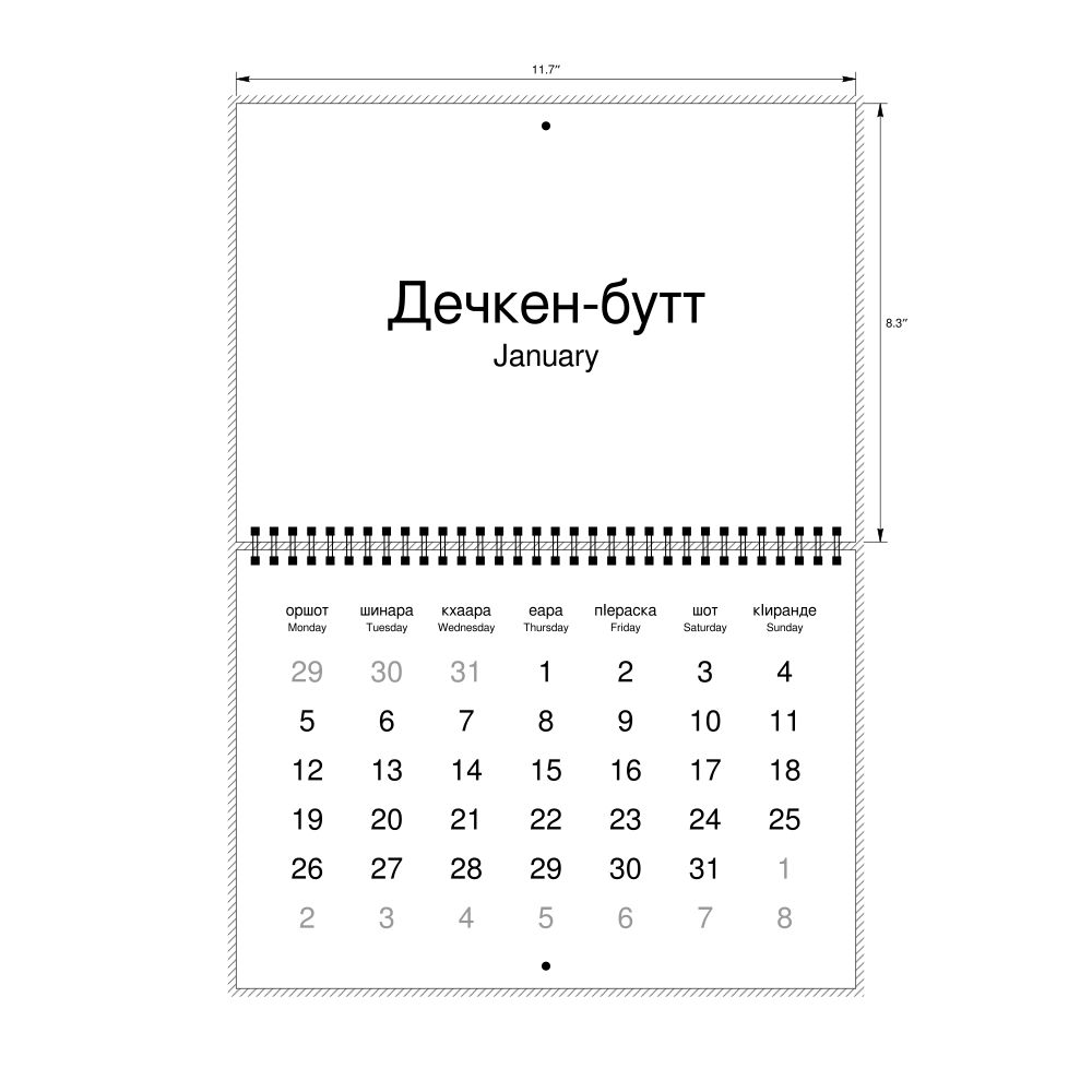 2027 Wall Calendar, Chechen/English-Labeled, Monday-Start Layout, Wire-Bound, 11.7 x 8.3 in (29.7 x 21.0 cm)