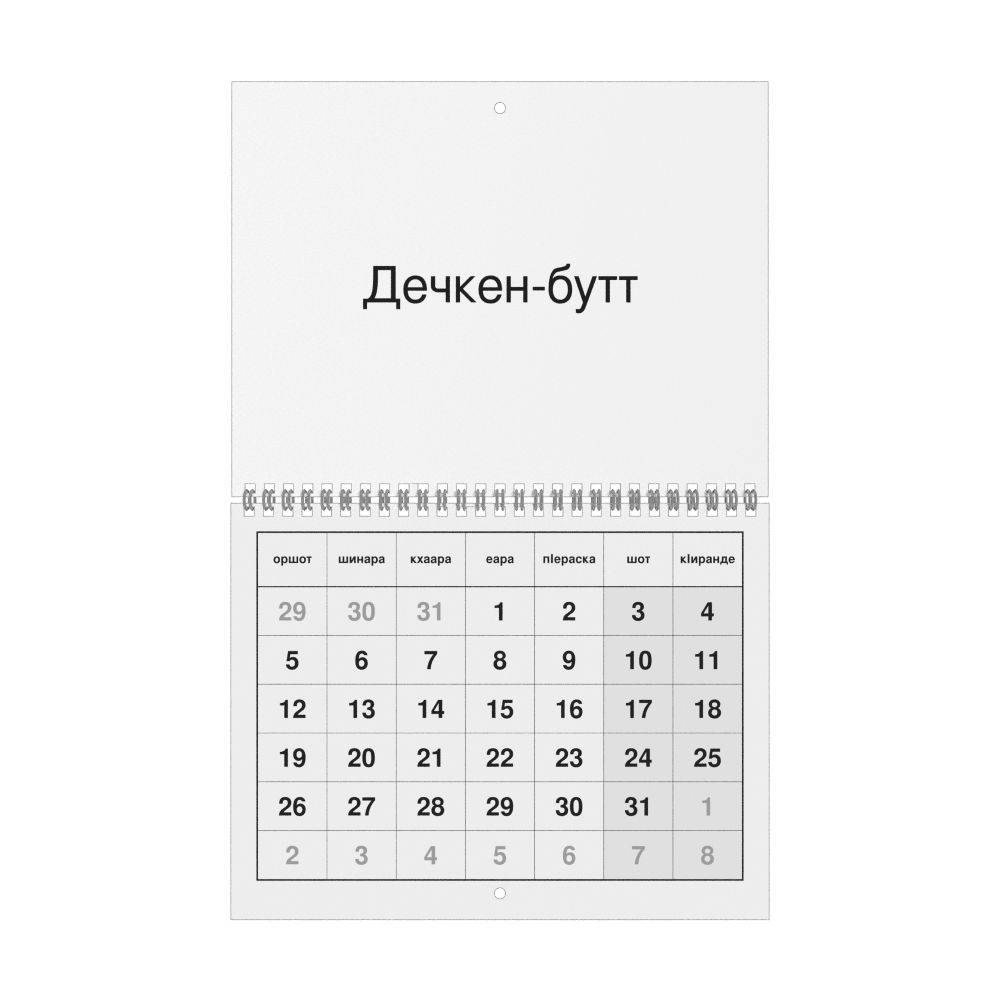 This calendar features the Chechen names of months and days of the week on top of a standard Gregorian calendar layout. Beyond its utility for tracking dates, it serves as an educational tool, cultural touchstone (cultural artifact), and functional decor (aesthetic object).