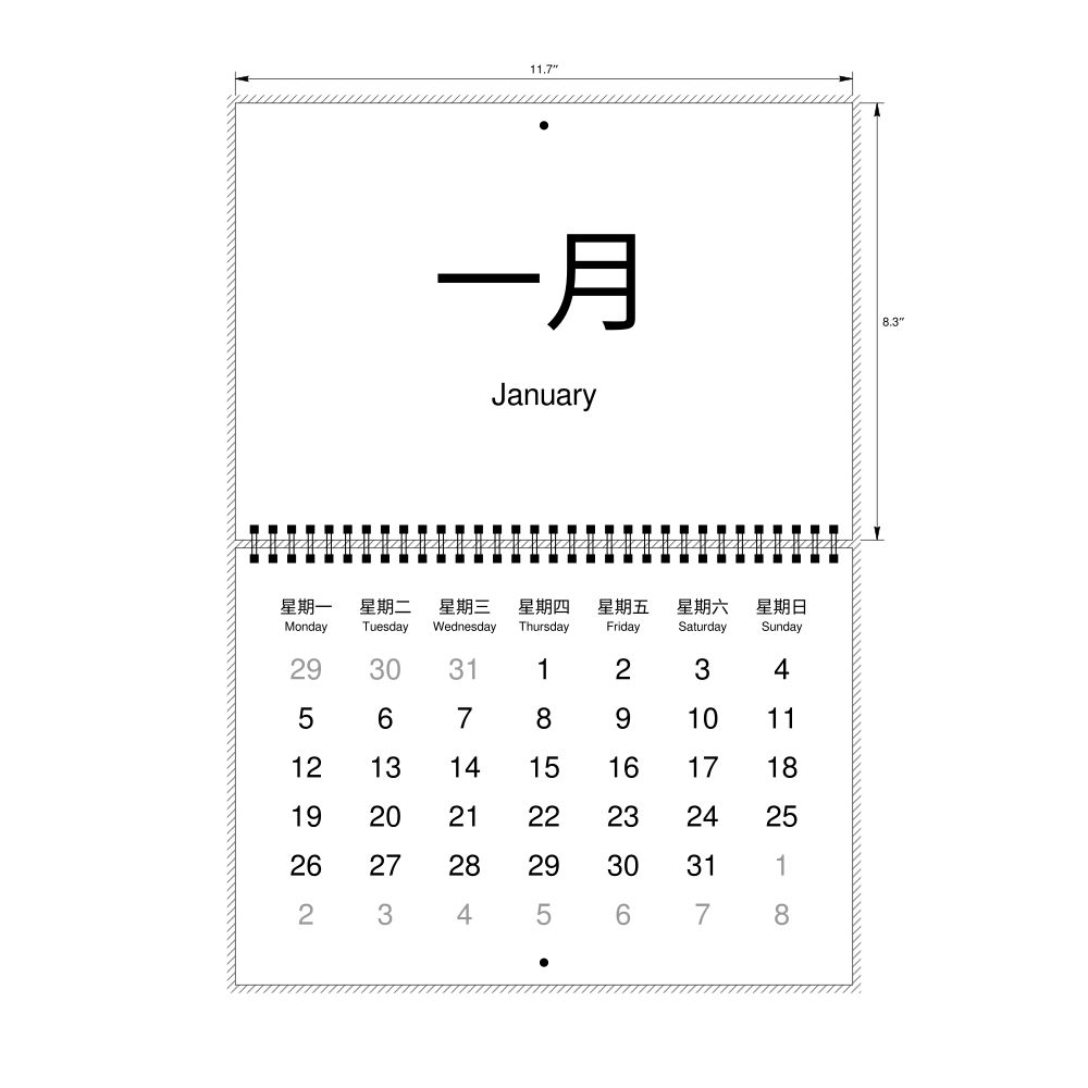 2027 Wall Calendar, Chinese/English-Labeled, Monday-Start Layout, Wire-Bound, 11.7 x 8.3 in (29.7 x 21.0 cm)
