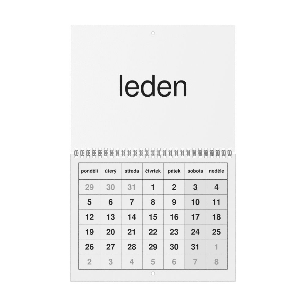 This calendar features the Czech names of months and days of the week on top of a standard Gregorian calendar layout. Beyond its utility for tracking dates, it serves as an educational tool, cultural touchstone (cultural artifact), and functional decor (aesthetic object).