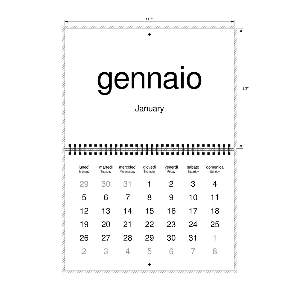 2026 Wall CalendarItalian/English-Labeled, Monday-Start Layout, Wire-Bound, 11.7 x 8.3 in (29.7 x 21.0 cm)