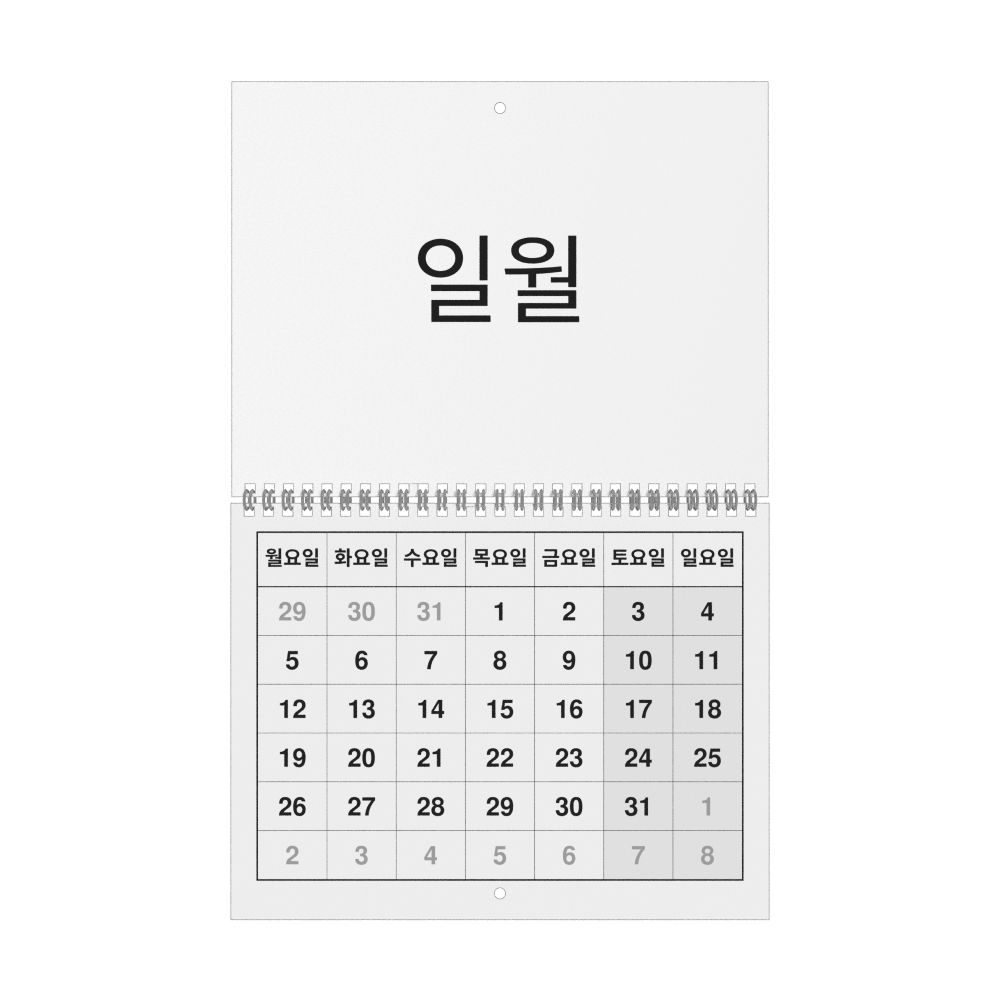 This calendar features the Korean names of months and days of the week on top of a standard Gregorian calendar layout. Beyond its utility for tracking dates, it serves as an educational tool, cultural touchstone (cultural artifact), and functional decor (aesthetic object).