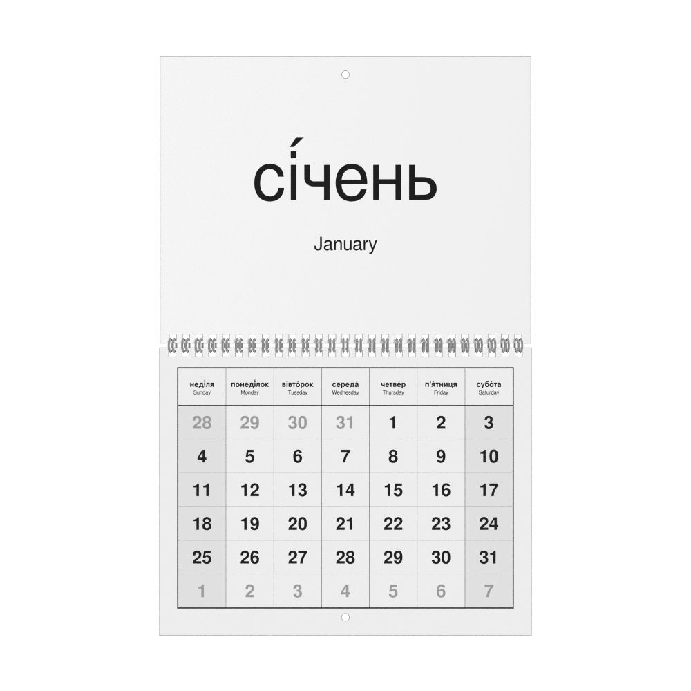 2026 Wall CalendarUkrainian/English-Labeled, Sunday-Start Layout, Wire-Bound, 11 x 8.5 in (27.9 x 21.6 cm)
