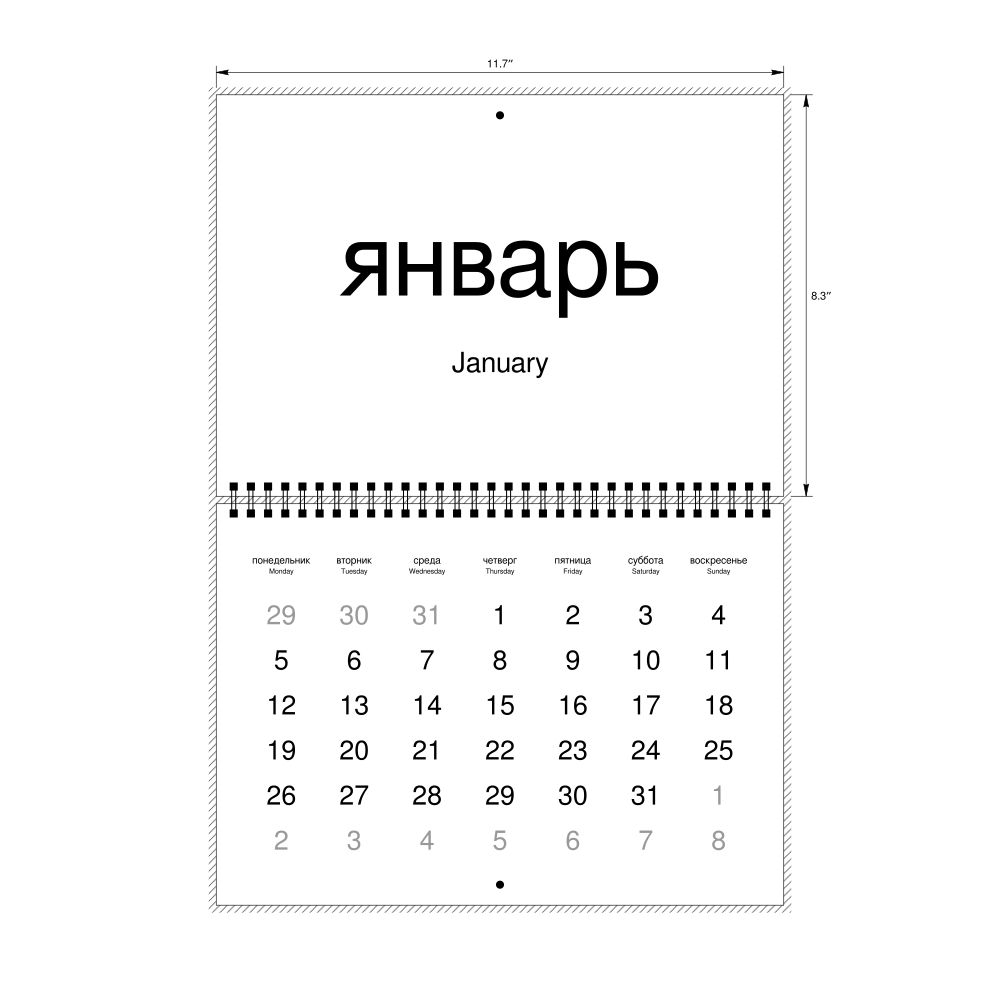 2027 Wall Calendar, Russian/English-Labeled, Sunday-Start Layout, Wire-Bound, 11.7 x 8.3 in (29.7 x 21.0 cm)