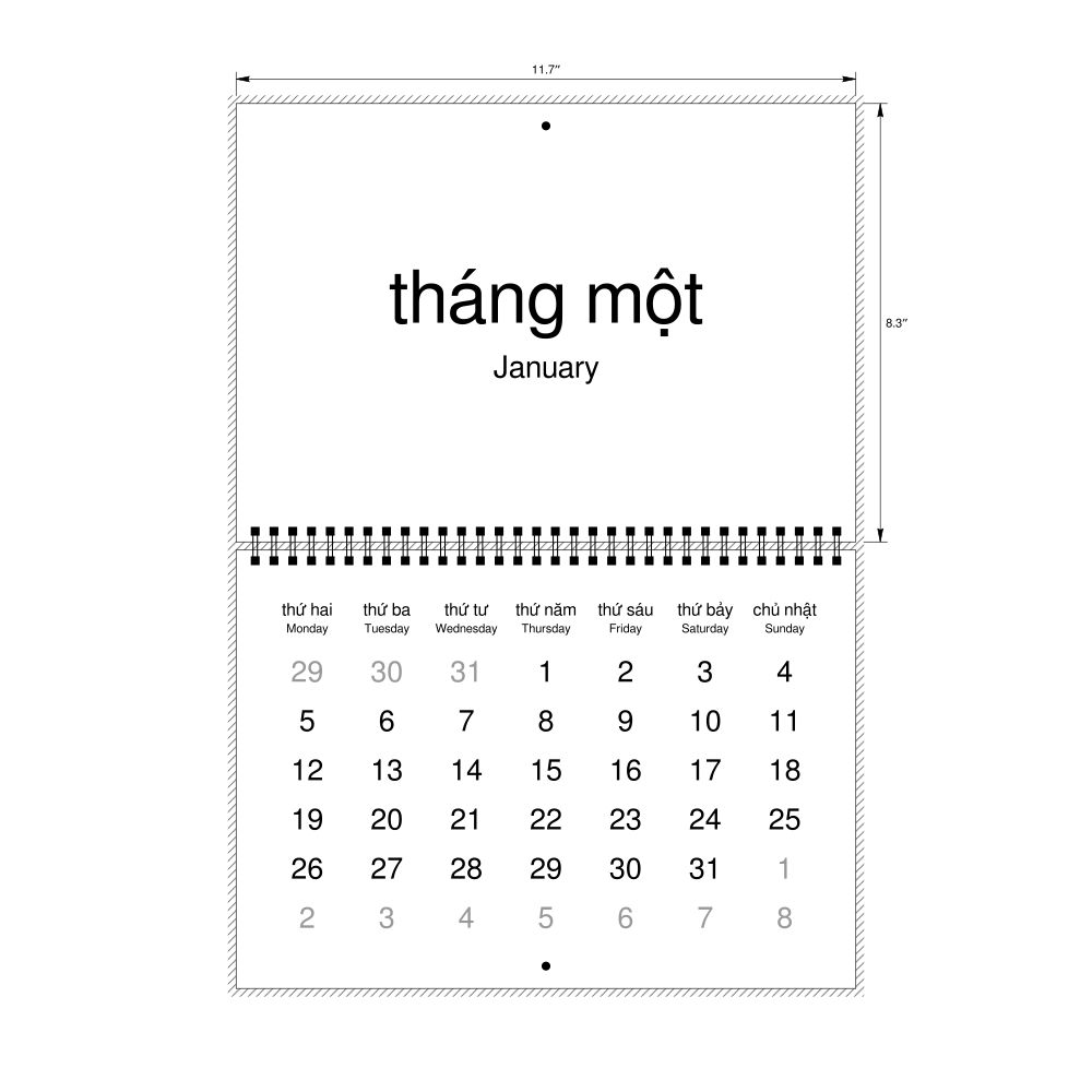 2026 Wall Calendar, Vietnamese-Labeled, Monday-Start Layout, Wire-Bound, 11.7 x 8.3 in (29.7 x 21.0 cm)