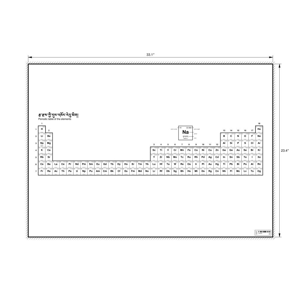 A periodic table chart in Tibetan (རྩ་རྫས་ཀྱི་དུས་འཁོར་རེའུ་མིག།) with English translations in the 33.1 x 23.4 in (84.1 x 59.4 cm, poster / wall chart) format. 32-column layout featuring the atomic numbers, atomic weights, symbols, and names of all chemical elements.