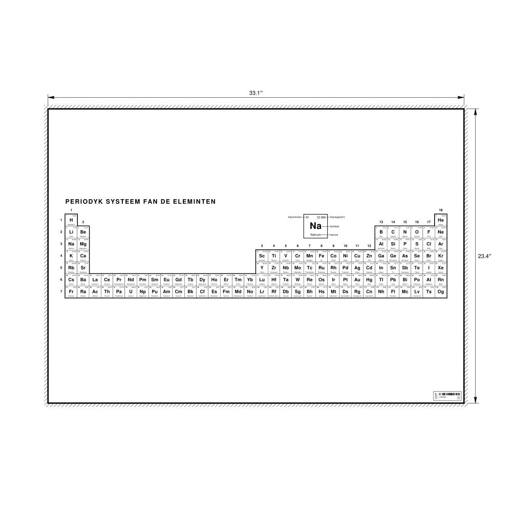 A periodic table chart in West Frisian (Periodyk systeem fan de eleminten) in the 33.1 x 23.4 in (84.1 x 59.4 cm, poster / wall chart) format. 32-column layout featuring the atomic numbers, atomic weights, symbols, and names of all chemical elements.