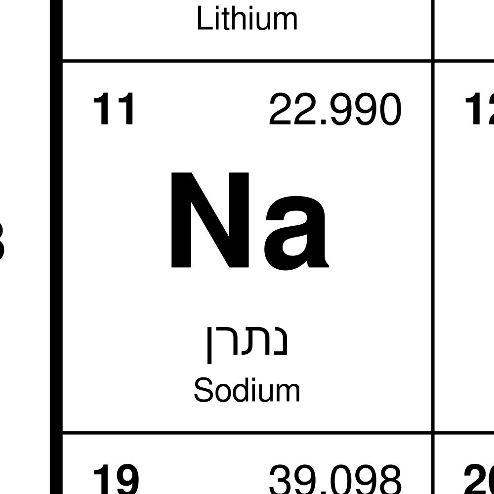 A Hebrew-language periodic table of the elements with English translations.