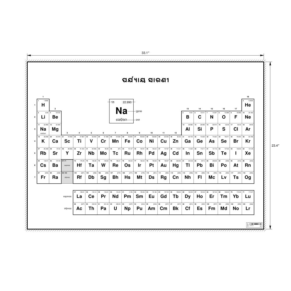 A periodic table chart in Odia (ପର୍ଯ୍ୟାୟ ସାରଣୀ) in the 33.1 x 23.4 in (84.1 x 59.4 cm, poster / wall chart) format. 18-column layout featuring the atomic numbers, atomic weights, symbols, and names of all chemical elements.