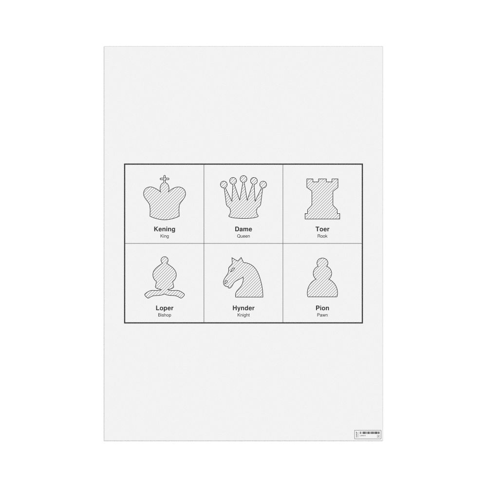 A poster of the chess pieces in West Frisian (Skaakstikken) with English translations.