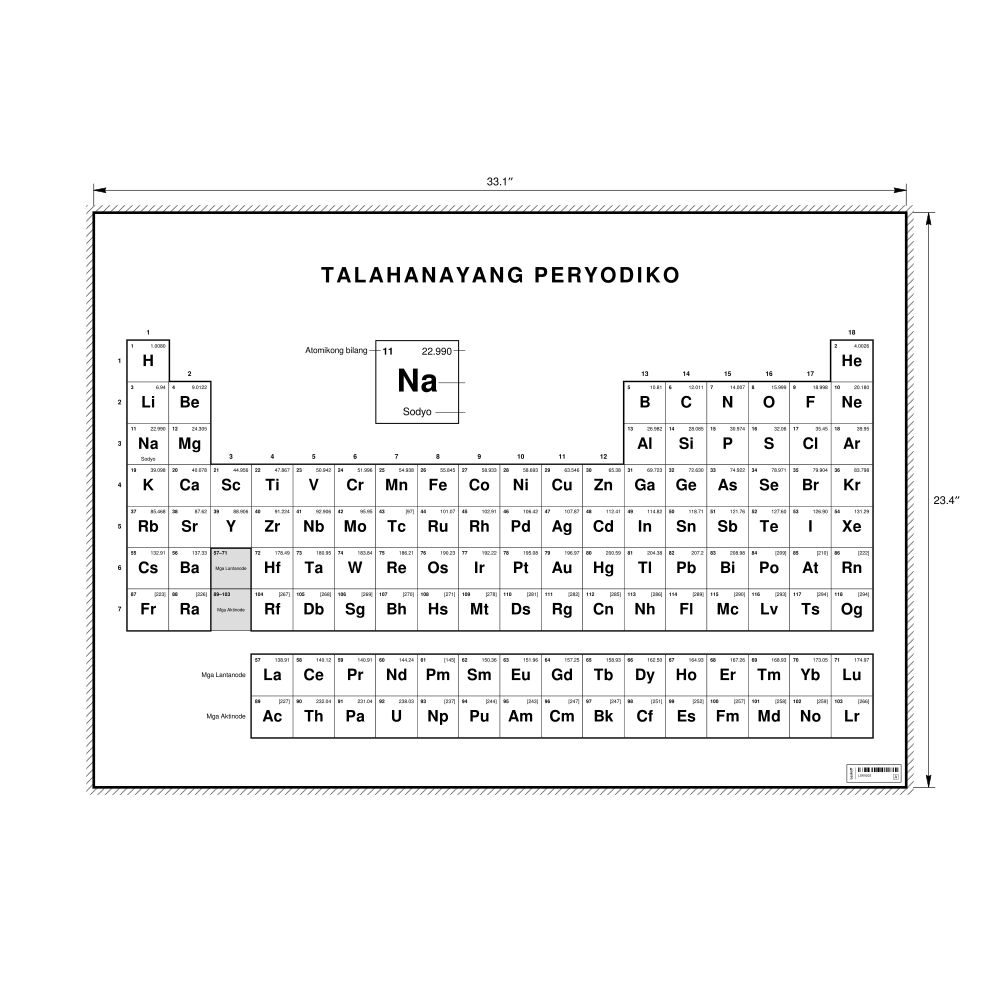 A periodic table chart in Tagalog (Talahanayang peryodiko) in the 33.1 x 23.4 in (84.1 x 59.4 cm, poster / wall chart) format. 18-column layout featuring the atomic numbers, atomic weights, symbols, and names of all chemical elements.