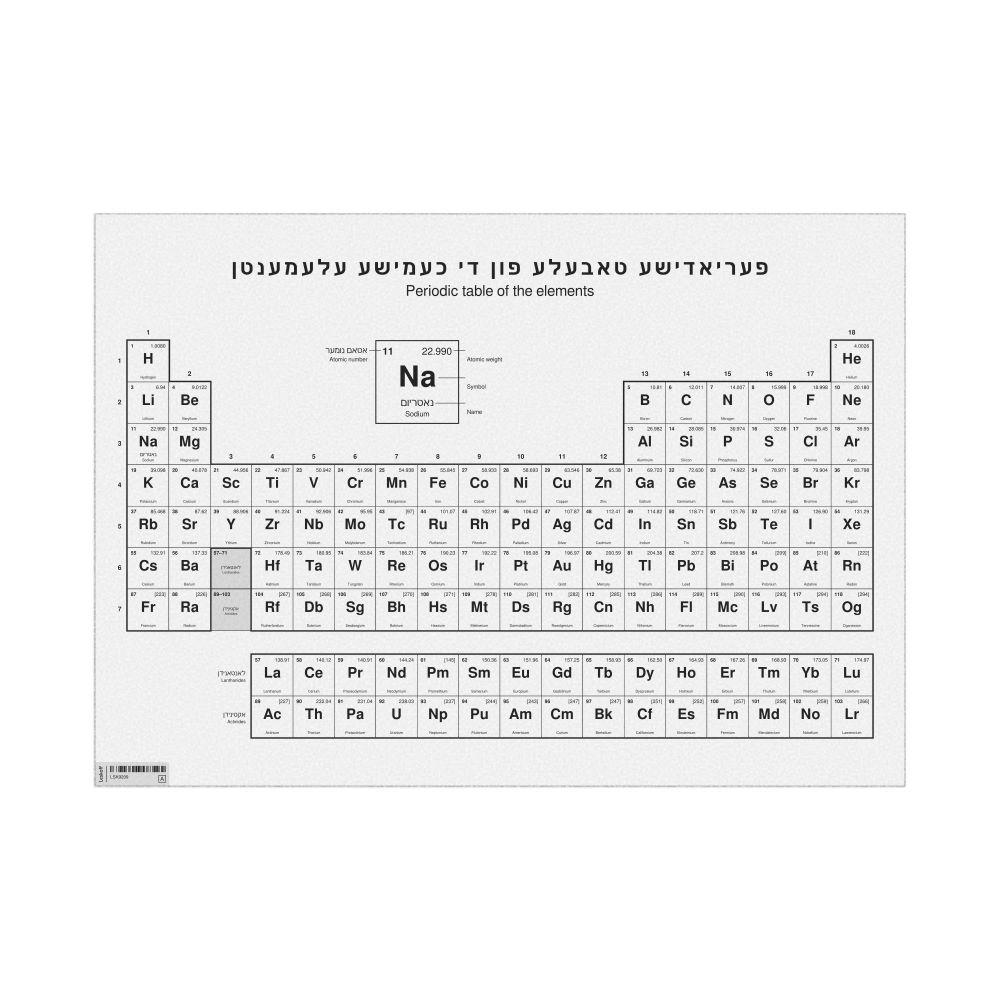 A periodic table chart in Yiddish (פעריאדישע טאבעלע פון די כעמישע עלעמענטן) with English translations in the 33.1 x 23.4 in (84.1 x 59.4 cm, poster / wall chart) format. 18-column layout featuring the atomic numbers, atomic weights, symbols, and names of all chemical elements.