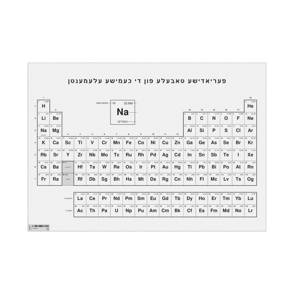 A periodic table chart in Yiddish (פעריאדישע טאבעלע פון די כעמישע עלעמענטן) in the 33.1 x 23.4 in (84.1 x 59.4 cm, poster / wall chart) format. 18-column layout featuring the atomic numbers, atomic weights, symbols, and names of all chemical elements.