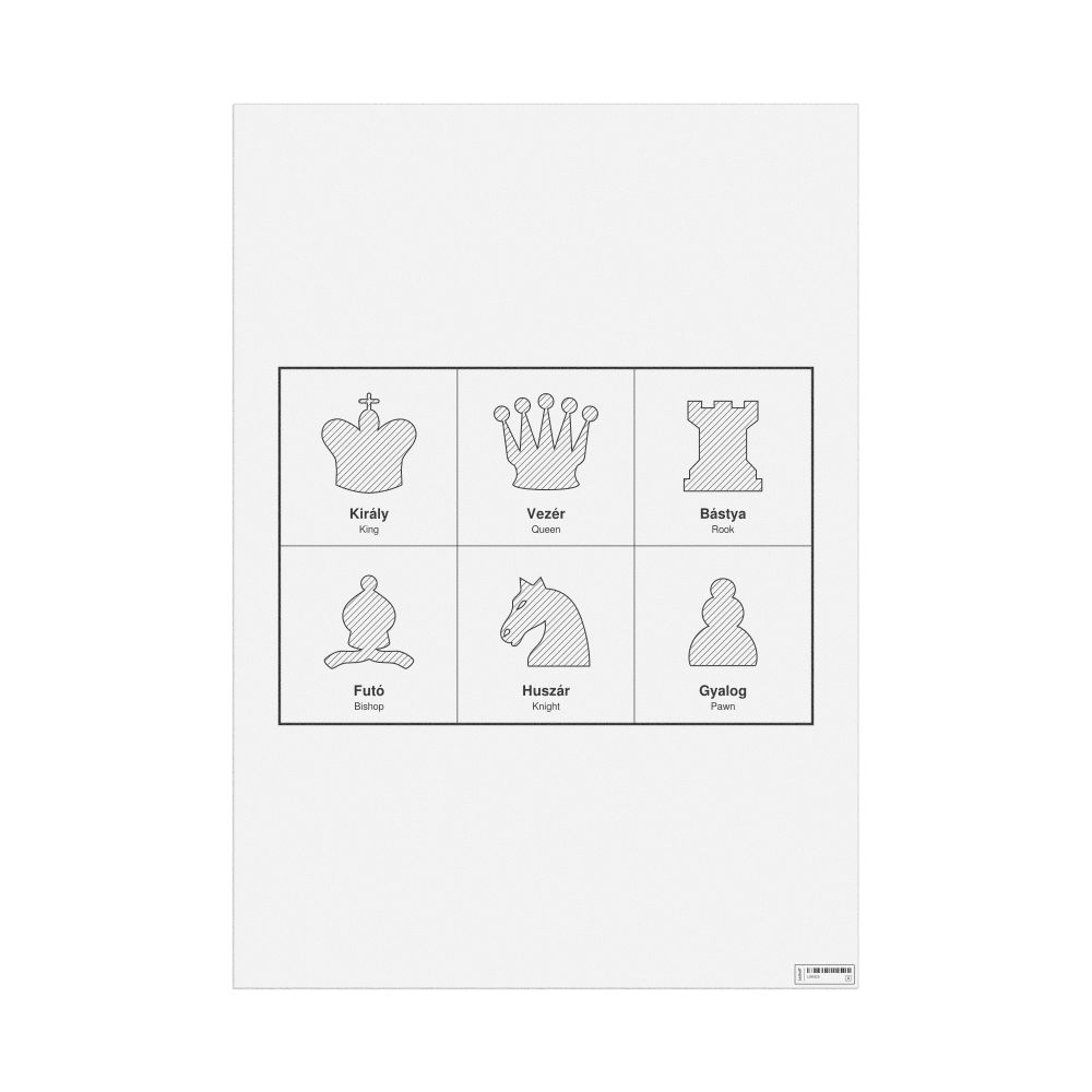 A poster of the chess pieces in Hungarian (Sakkfigurák) with English translations.