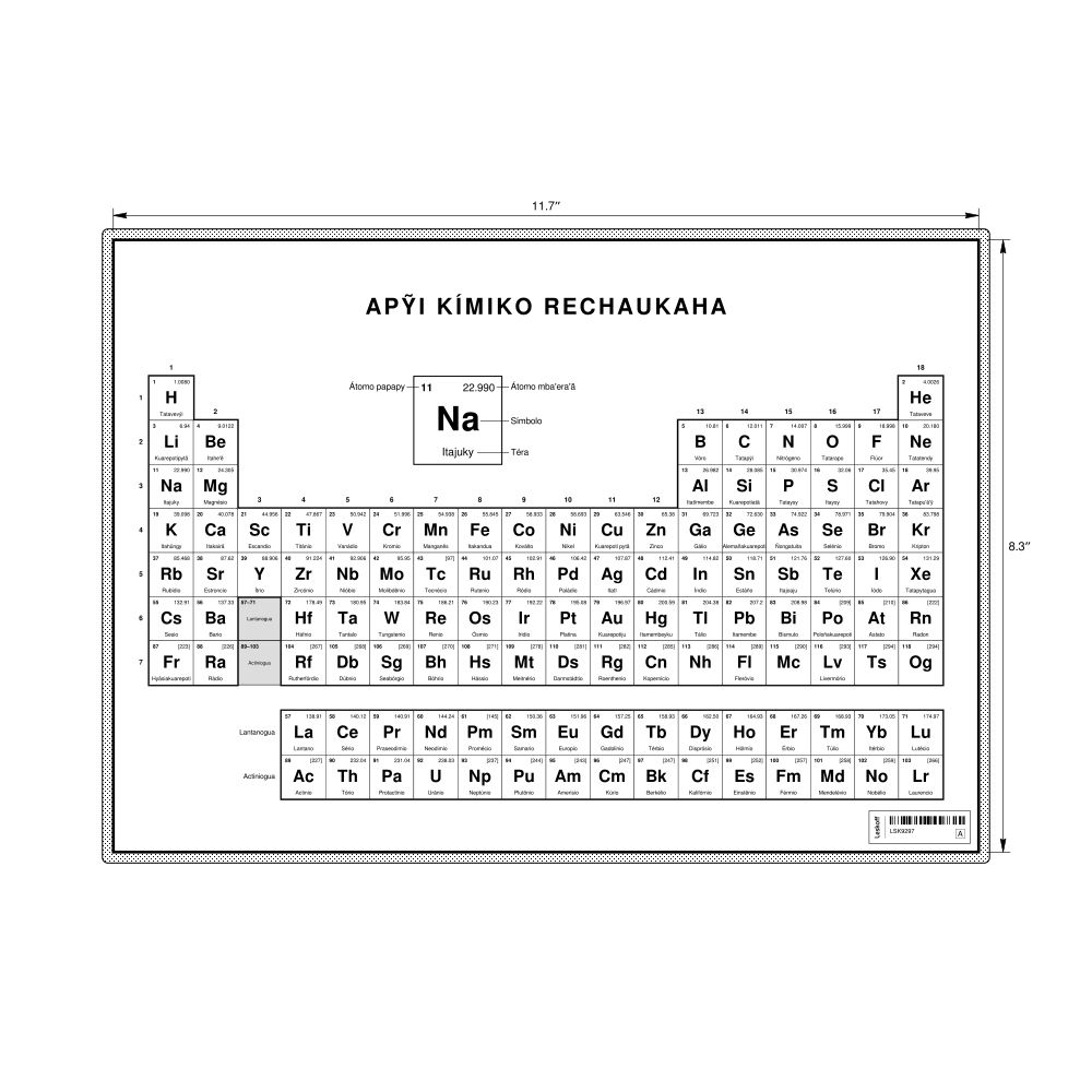 A periodic table chart in Guarani (Apỹi kímiko rechaukaha) in the 11.7 x 8.3 in (29.7 x 21.0 cm, desk chart, laminated) format. 18-column layout featuring the atomic numbers, atomic weights, symbols, and names of all chemical elements.
