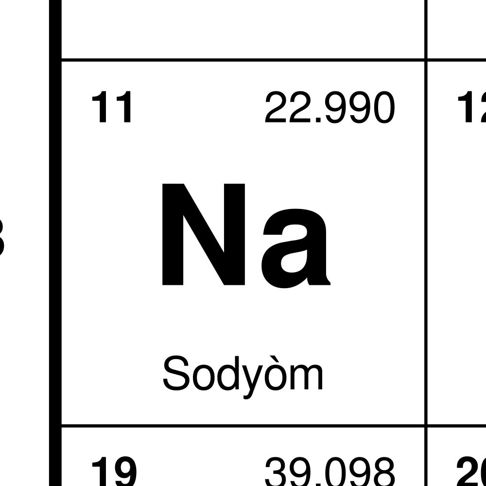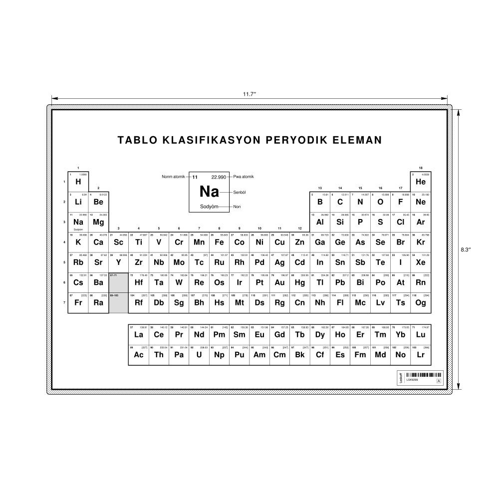 A periodic table chart in Haitian Creole (Tablo klasifikasyon peryodik eleman) in the 11.7 x 8.3 in (29.7 x 21.0 cm, desk chart, laminated) format. 18-column layout featuring the atomic numbers, atomic weights, symbols, and names of all chemical elements.