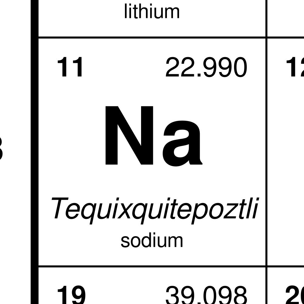A Nahuatl-language periodic table of the elements with English translations.