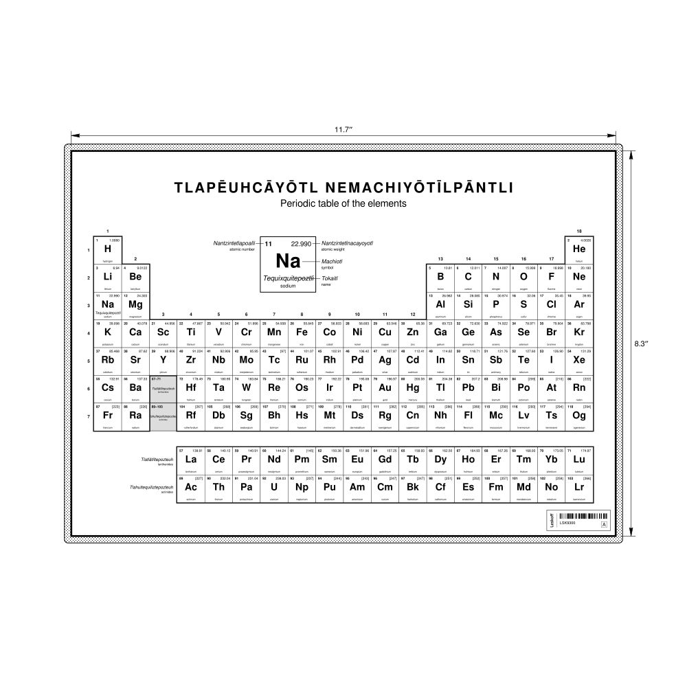 A periodic table chart in Nahuatl (Tlapēuhcāyōtl nemachiyōtīlpāntli) with English translations in the 11.7 x 8.3 in (29.7 x 21.0 cm, desk chart, laminated) format. 18-column layout featuring the atomic numbers, atomic weights, symbols, and names of all chemical elements.