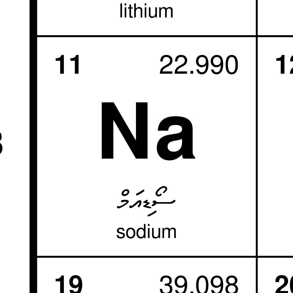 A periodic table chart in Maldivian (ޕީރިއަޑިކް ތާވަލު) with English translations in the 11.7 x 8.3 in (29.7 x 21.0 cm, desk chart, laminated) format. 18-column layout featuring the atomic numbers, atomic weights, symbols, and names of all chemical elements.